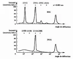 Expérimentalement, on peut mettre en évidence l'apparition de ce désordre magnétique (tendance des moments magnétiques à s'orienter aléatoirement) grâce à la diffraction de neutrons[13]. En effet, si les électrons peuvent diffracter selon la loi de Bragg grâce aux interactions électrostatiques des atomes dans les structures cristallines, on peut avoir une diffraction des neutrons par interaction des moments magnétiques, lorsqu'ils possèdent aussi un certain ordre. Ainsi, plus le matériau est ordonné, plus il comporte de plans de diffraction et donc un nombre de pics élevé en intensité en fonction de l'angle de diffraction. On rappelle qu'il y a diffraction lorsqu'on respecte les conditions de Bragg: ,