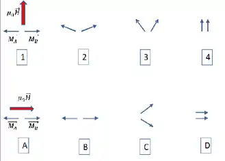 Différence de comportement des moments magnétiques dans un antiferromagnétique en fonction de l'orientation du champ. (Haut) Lorsque le champ est perpendiculaire au paramètre d'ordre de Néel, les moments s'inclinent légèrement pour avoir une composante vectorielle le long du champ(1). Pour un champ assez fort, l'aimantation est saturée (4) (Bas) Avec un champ parallèle au paramètre d'ordre de Néel, l'aimantation orientée selon le champ augmente, tandis que celle de l'autre sous-réseau diminue.