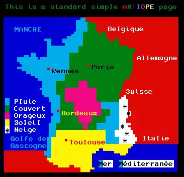Antiope est l'acronyme d'Acquisition numérique et télévisualisation d'images organisées en pages d'écriture. Système français de télétexte et Vidéotex utilisé en télédiffusion dans les années 1980. Ce système de transmission de données numériques exploite les lignes invisibles du signal de télévision retransmis en analogique. Il a principalement été associé au standard Sécam.