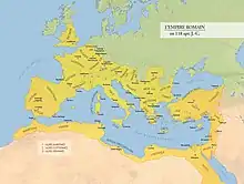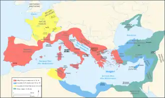 Dans l'ouest du monde méditerranéen, l'Italie passe au même moment sous le contrôle de la République romaine, qui étend ensuite sa domination sur toutes les rives de la Méditerranée, soumettant les royaumes hellénistiques, et s'imprégnant profondément de culture grecque. À la fin du Ier siècle av. J.-C., Rome devient une monarchie, l'empire romain, qui connaît son apogée au IIe siècle (la pax romana), avant de connaître une période d'instabilité interne et de menaces extérieures au IIIe siècle face à un nouvel empire perse à l'est et aux raids de peuples « barbares » sur sa frontière nord.