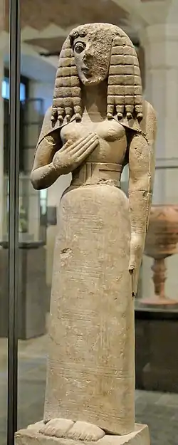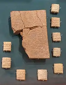 - des sources épigraphiques, des textes retrouvés sur des sites antiques[26],[27] : les inscriptions sur pierre retrouvées sur les sites antiques, qui constituent une source importante pour l'Antiquité gréco-romaine, mais qui sont également présentes dans les autres civilisations antiques ; les ostraca, écrits sur tessons de poteries ou éclats de calcaire, constituent une autre source écrite importante ; les textes sur tablettes d'argile, essentiellement les centaines de milliers de tablettes cunéiformes, qui couvrent une vaste gamme de sujets (gestion, administration, religion, sciences, littérature, éducation, correspondance officielle et privée, etc.) et constituent l'essentiel de la documentation écrite provenant des civilisations du Proche-Orient ancien[28] ;