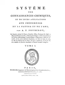 • Antoine François Fourcroy, Système des connaissances chimiques et de leurs applications aux phénomènes de la nature et de l'art, Baudouin, 1801 (11 volumes), imprimeur de l'institut national des sciences et des arts, brumaire an IX