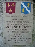 « […] a succédé à Monsieur l’évêque de Digne Anthoine Hérouet, iceluy a fait quelques réparations en ladite abbaye, & l’on voit ses armes en plusieurs lieux, qui sont deux lyons & une bande cannellée ou ondée. »