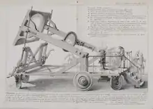 - Assis dans un fauteuil, Seguin porte un masque facial « de cuir et de cuivre muni de doubles tubulures alimentant en air ses poumons ou reprenant les gaz expirés, qui sont envoyés dans des récipients ou cloches retournés dans des bacs à eau ou à mercure »[30]