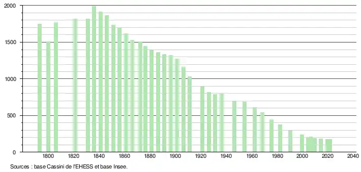 L'évolution du nombre d'habitants est connue à travers les recensements de la population effectués dans la commune depuis 1793. Pour les communes de moins de 10 000 habitants, une enquête de recensement portant sur toute la population est réalisée tous les cinq ans, les populations légales des années intermédiaires étant quant à elles estimées par interpolation ou extrapolation[21]. Pour la commune, le premier recensement exhaustif entrant dans le cadre du nouveau dispositif a été réalisé en 2004[22].