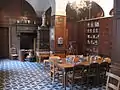 - L’apothicairerie, avec des frises présentant des peintures imitant le marbre, des boiseries rehaussées d’or, des étagères, rayonnages, placards, tiroirs et vitrines décorées de pilastres sculptés, et une belle collection de faïences à décor bleu et fleurs jaunes des ateliers de Lyon, Nevers, de la fin du XVIIe siècle.