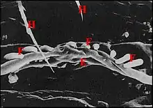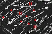 Dans les coupes histologiques (C.H.), à la loupe binoculaire et surtout au microscope électronique à balayage (M.E.B)[14], les fusules se présentent comme des structures de forme assez constante mais de disposition plus variable. Leur compte permet évidemment celui des corps acineux, donc des glandes prégonoporales, souvent difficile et parfois impossible dans les coupes histologiques (C.H.) lorsqu’elles y sont trop nombreuses. Soulignons qu'elles ne doivent pas être confondues avec les poils qui les entourent, surtout lorsqu'ils sont lisses (Fig. ), plutôt que barbelés (Fig. ).