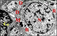 - Le corps cellulaire est ovoïde, assez volumineux et mesure approximativement 15 µm dans son grand axe, 10 dans le petit. Le noyau est plus ou moins arrondi, régulier et à chromatine peu dense, répartie en mottes, les plus petites s’accolant à l’enveloppe nucléaire. Le cytoplasme renferme du réticulum endoplasmique granulaire ou rugueux formant des saccules plus ou moins enroulés, des dictyosomes et de nombreuses mitochondries (Fig.25).
