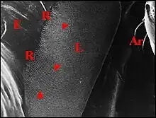Elle comporte vers l’extérieur une épicuticule régulièrement ondulée, mince (0,4 nm) et présentant deux couches : l’une externe, très dense aux électrons ; l’autre interne, moins dense, moins homogène et d’épaisseur plus réduite. À leur zone de contact, ces couches forment de fines denticulations qui s’interpénètrent et les engrènent étroitement l’une dans l’autre.