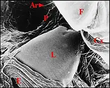 - L’archet frotte contre la lyre, ce jeu mécanique étant responsable soit d’une émission sonore présumée ou avérée, soit, du moins chez les Theridiidae Argyrodes, d’une stimulation nerveuse inédite et beaucoup plus subtile qui serait impliquée dans l’équilibration (Lopez, 1988a ; Lopez, 1988b ; Lopez, 1994a ; Lopez, 1994b)[9],[10],[11],[12], de concert avec des organes lyriformes pédiculaires en « bourrelet », situés sur le pédicule et également étudiés chez les Meta (Lopez & Juberthie-Jupeau, 1994a et b).
