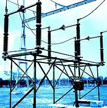 - le matériel sous enveloppe métallique ou blindé (GIS, de : Gas insulated switchgear), dont l'isolement est fait dans le SF6. Il est muni d’une enveloppe métallique, reliée à la terre, ce qui permet d’éviter tout contact accidentel avec les pièces sous tension. Une cellule isolée au SF6 comprend les différents organes nécessaires au fonctionnement du poste : disjoncteur, jeu de barres, sectionneur de jeu de barres, sectionneur de terre, transformateur de courant, transformateur de tension (ou transformateur de potentiel) et parfois parafoudre[29],[30],[31],[32].