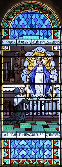 Vitrail de l'église de Nangis représentant l'apparition et la vision du 27 novembre origine de la médaille miraculeuse.
