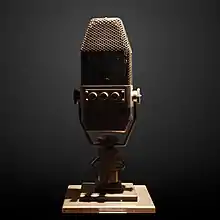 Charles de Gaulle au micro de la BBC à Londres. Cette photographie est postérieure au car le Général porte sur sa vareuse l'insigne à croix de Lorraine[1], adoptée comme emblème de la France libre en juillet de la même année[3]. Comme il n'existe aucun cliché de l'appel du 18 Juin, cette image est souvent utilisée comme illustration du célèbre discours radiodiffusé[1]. | |
