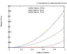 Le deuxième terme le plus significatif (de troisième ordre) se décompose en cube du premier terme; ainsi, même pour un angle tel que 0,01, la valeur du deuxième terme le plus significatif est de l'ordre de 0,000 001, ou110 000 du premier terme. On peut ainsi approximer sans problème :