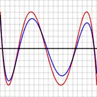 Erreur entre le polynôme optimal de degré 4 et le logarithme népérien ln (en rouge), et entre l'approximation de Tchebychev de ln (en bleu) sur l'intervalle [2, 4]. Le pas vertical est de 10−5. L'erreur maximale pour le polynôme optimal est de 6,07 × 10−5.