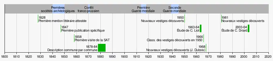 La frise de la figure 9 replace la chronologie présumée de l'aqueduc dans l'histoire des lieux qu'il traverse. L'important hiatus séparant le Ve du IXe siècle s'explique par la rareté des vestiges archéologiques attestés de cette époque comme par la faiblesse des sources écrites entre Grégoire de Tours et les premières chartes des grandes abbayes au IXe siècle[24].