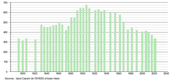 L'évolution du nombre d'habitants est connue à travers les recensements de la population effectués dans la commune depuis 1793. Pour les communes de moins de 10 000 habitants, une enquête de recensement portant sur toute la population est réalisée tous les cinq ans, les populations légales des années intermédiaires étant quant à elles estimées par interpolation ou extrapolation[28]. Pour la commune, le premier recensement exhaustif entrant dans le cadre du nouveau dispositif a été réalisé en 2005[29].