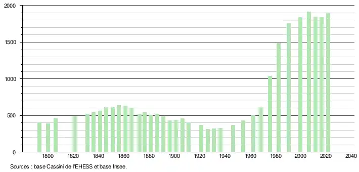 L'évolution du nombre d'habitants est connue à travers les recensements de la population effectués dans la commune depuis 1793. Pour les communes de moins de 10 000 habitants, une enquête de recensement portant sur toute la population est réalisée tous les cinq ans, les populations légales des années intermédiaires étant quant à elles estimées par interpolation ou extrapolation[22]. Pour la commune, le premier recensement exhaustif entrant dans le cadre du nouveau dispositif a été réalisé en 2006[23].