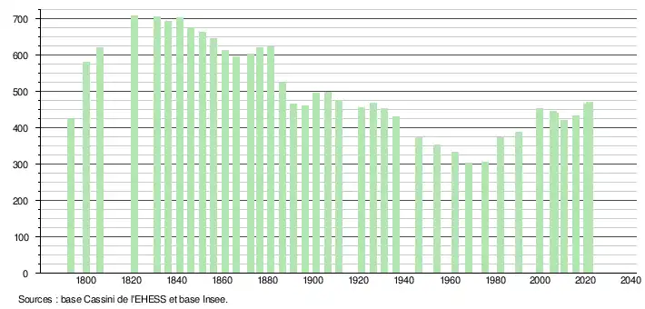 - Population municipale légale en vigueur au 1er janvier 2024, millésimée 2021, définie dans les limites territoriales en vigueur au 1er janvier 2023, date de référence statistique : 1er janvier 2021.