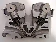 Coupe d'une culasse DOHC, montrant les cames au-dessus des soupapes, avec poussoirs interposés.