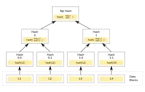 Dans la figure, l'ensemble de données est représenté par les blocs[Quoi ?] L1 à L4. L'arbre est constitué par un ensemble de valeurs de hash[Quoi ?] interdépendantes. Les feuilles de l'arbre sont les valeurs de hash de chacun des blocs de données initiales. Dans un arbre de Merkle binaire, ces hashs sont alors concaténés deux à deux pour pouvoir calculer un nouveau hash parent. Ainsi de suite jusqu'au sommet de l'arbre où on obtient un hash-sommet. Si le nombre de blocs, ou les hashs intermédiaires ne forment pas un arbre binaire, on complète la base avec suffisamment de blocs vides.