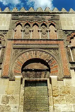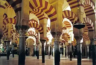 Le plus bel exemple en est, bien entendu, la grande mosquée de Cordoue commencée en 785 par l'émir Abd-el-Rahman Ier dont la salle de prière est ornée de superbes arcatures ajourées présentant deux niveaux d'arcs aux claveaux blancs et rouges (brique et pierre) : les arcs inférieurs sont en fer à cheval, tandis que les arcs supérieurs, plus larges, sont en demi-cercle[30].