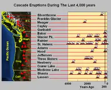Les volcans des Cascades font partie de la ceinture de feu du Pacifique. Ils sont le lieu des éruptions les plus récentes des États-Unis et du Canada.