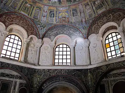 Dans quelques églises romanes, particulièrement celles élevées sur les bords du Rhin, on avait eu l'idée d'éclairer les charpentes au-dessus des voûtes en berceau, au moyen d'une suite d'arcatures à jour, formant des galeries basses sous les corniches. Les voutes en berceau des nefs ou celles en cul-de-four des absides laissaient entre leurs reins et le niveau de la corniche convenablement élevée pour laisser passer les entraits des charpentes au-dessus de l'extrados, un mur nu qui était d'un aspect désagréable, et qui de plus était d'une grande pesanteur (cf. illustration).