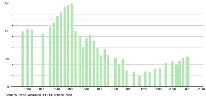 L'évolution du nombre d'habitants est connue à travers les recensements de la population effectués dans la commune depuis 1793. Pour les communes de moins de 10 000 habitants, une enquête de recensement portant sur toute la population est réalisée tous les cinq ans, les populations légales des années intermédiaires étant quant à elles estimées par interpolation ou extrapolation[14]. Pour la commune, le premier recensement exhaustif entrant dans le cadre du nouveau dispositif a été réalisé en 2004[15].
