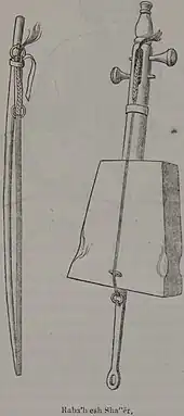 Différents archets : alto, contrebasse (modèle allemand), gadoulka, kamânche ; ils retracent grossièrement l'évolution de l'archet.