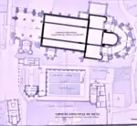 Malgré les démolitions de 1867, les fouilles ont révélé sous le dallage actuel, à environ quarante centimètres, le sol de l'église du XVe siècle et 1,15 m sous le sol actuel, le dallage primitif. Cette différence de niveau a permis de mettre au jour les fondations des absides. L'abside Est qui porte la mosaïque est de l'époque de Théodulf. À l'Ouest, on retrouve les fondations d'une abside semi-circulaire visiblement remaniée en octogone avec un mur parallèle[14]. On peut y voir la loge de l'évêque comme celle de Charlemagne à la chapelle palatine d'Aix-la-Chapelle puis l'aménagement d'un porche[12].