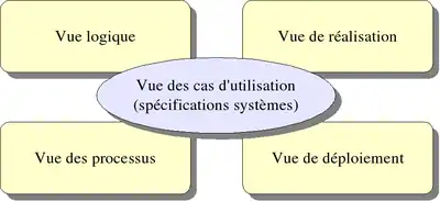 Le modèle de Kruchten[7] dit modèle des 4 + 1 vues est celui adopté dans le processus unifié[8]. Ici encore, le modèle d'analyse, baptisé vue des cas d'utilisation, constitue le lien et motive la création de tous les diagrammes d'architecture.