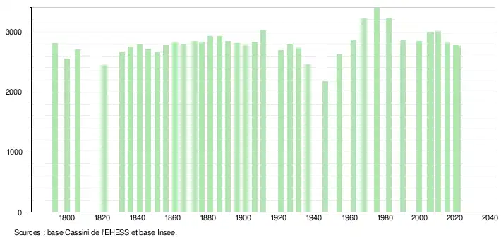 L'évolution du nombre d'habitants est connue à travers les recensements de la population effectués dans la commune depuis 1793. Pour les communes de moins de 10 000 habitants, une enquête de recensement portant sur toute la population est réalisée tous les cinq ans, les populations légales des années intermédiaires étant quant à elles estimées par interpolation ou extrapolation[36]. Pour la commune, le premier recensement exhaustif entrant dans le cadre du nouveau dispositif a été réalisé en 2005[37].