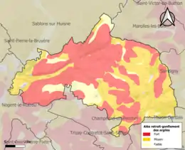 La commune est vulnérable au risque de mouvements de terrains constitué principalement du retrait-gonflement des sols argileux[17]. Cet aléa est susceptible d'engendrer des dommages importants aux bâtiments en cas d’alternance de périodes de sécheresse et de pluie. 90 % de la superficie communale est en aléa moyen ou fort (52,8 % au niveau départemental et 48,5 % au niveau national). Sur les 1 078 bâtiments dénombrés sur la commune en 2019, 913 sont en aléa moyen ou fort, soit 85 %, à comparer aux 70 % au niveau départemental et 54 % au niveau national. Une cartographie de l'exposition du territoire national au retrait gonflement des sols argileux est disponible sur le site du BRGM[18],[Carte 1].