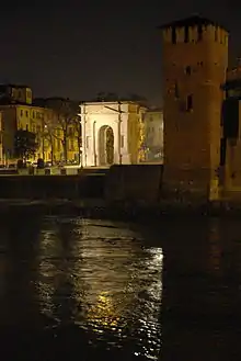 Sa construction date du milieu du Ier siècle. Il a été édifié à la gloire d'une des familles les plus en vue de la Vérone romaine, la gens Gavia, et en particulier de certains de ses membres, Strabon, Maxime, Lucius et Vibius, dont on lit encore les noms sous les niches qui abritaient autrefois leurs statues. L'arc occupait une position privilégiée et marquait le début de la Via Sacra. L'arc antique fut abattu en 1805 pendant les guerres napoléoniennes parce qu'il empêchait le passage des convois militaires. Mais ses fragments furent conservés et numérotés. L'édifice ne sera reconstruit qu'en 1932, à un endroit différent, près de l'Adige, non loin du Castelvecchio.