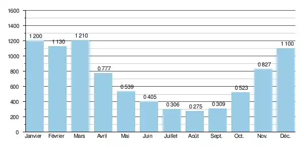 Aux étiages, le VCN3 peut chuter jusque 0,110 m3/s (110 litres/s), en cas de période quinquennale sèche, ce qui ne peut être qualifié de sévère pour un aussi petit cours d'eau[2].