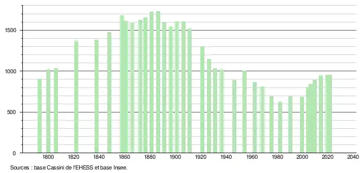L'évolution du nombre d'habitants est connue à travers les recensements de la population effectués dans la commune depuis 1793. Pour les communes de moins de 10 000 habitants, une enquête de recensement portant sur toute la population est réalisée tous les cinq ans, les populations légales des années intermédiaires étant quant à elles estimées par interpolation ou extrapolation[22]. Pour la commune, le premier recensement exhaustif entrant dans le cadre du nouveau dispositif a été réalisé en 2004[23].
