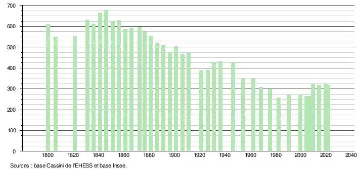 L'évolution du nombre d'habitants est connue à travers les recensements de la population effectués dans la commune depuis 1800. Pour les communes de moins de 10 000 habitants, une enquête de recensement portant sur toute la population est réalisée tous les cinq ans, les populations légales des années intermédiaires étant quant à elles estimées par interpolation ou extrapolation[24]. Pour la commune, le premier recensement exhaustif entrant dans le cadre du nouveau dispositif a été réalisé en 2004[25].