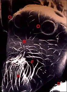 Le prosome ou céphalothorax et ses divers appendices, dont les pattes, sont jaunâtres, les yeux antérieurs séparés et plus gros que les autres (Fig.1,2). Le clypéus ou bandeau (B) est la particularité la plus remarquable de cette araignée, bien mise en évidence au microscope électronique à balayage (M.E.B.). Démesuré et concave, il s'allonge en un grotesque "menton" pointu (Fig.1 : P) au-dessus des chélicères dont il a à peu près la longueur, les surplombe et les dissimule. Cette projection correspond au type morphologique "prognathe" des Argyrodes le plus achevé (Lopez, 1977). Elle se déprime en une profonde fossette médiane (F) garnie de nombreux poils et où débouchent vraisemblablement par des pores les canaux excréteurs d'une glande clypéale ou acronale observée par histologie chez l'espèce sud-américaine voisine Faiditus atopus.