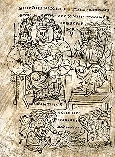 Le premier concile de Nicée, convoqué par Constantin en 325, rejeta l'arianisme. Celui-ci fut dès lors qualifié d'hérésie par les chrétiens trinitaires, mais les controverses sur la double nature, divine et humaine, du Christ (Dieu fait homme), se prolongèrent pendant plus d'un demi-siècle entre les chrétiens ariens et les chrétiens nicéens.