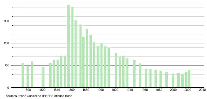 | L'évolution du nombre d'habitants est connue à travers les recensements de la population effectués dans la commune depuis 1793. Pour les communes de moins de 10 000 habitants, une enquête de recensement portant sur toute la population est réalisée tous les cinq ans, les populations légales des années intermédiaires étant quant à elles estimées par interpolation ou extrapolation[36]. Pour la commune, le premier recensement exhaustif entrant dans le cadre du nouveau dispositif a été réalisé en 2007[37]. En 2021, la commune comptait 81 habitants[Note 7], en augmentation de 22,73 % par rapport à 2015 (Hautes-Pyrénées : +1,04 %, France hors Mayotte : +1,84 %). |
