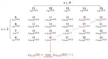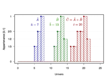 Pour calculer le degré d'appartenance de 18 à l'ensemble flou , il est nécessaire de construire tous les couples de valeurs tels que , et où . En effet, cinq couples voient leur somme égale à 18 et tous peuvent donc être à l'origine de ce résultat. De manière logique, on peut donc écrire :