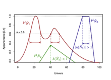 Un sous-ensemble flou [1] sur (représentant par exemple les vitesses dites « élevées ») est défini par sa fonction d'appartenance (ou fonction caractéristique) . Pour une vitesse donnée, v, représente alors le degré d'appartenance de v à .