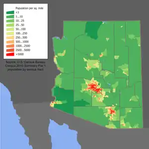 L'État a connu une croissance démographique importante et soutenue au cours du XXe siècle : il ne comptait que 750 000 habitants en 1950 et a vu sa population multipliée par sept en soixante ans. La ville de Tucson, située à une centaine de kilomètres de la frontière mexicaine, a ainsi accueilli d'importants flux migratoires. En 2010, l'État de l'Arizona avait la quatrième plus forte proportion d'Hispaniques après le Nouveau-Mexique (46,30 %), le Texas (37,62 %) et la Californie (37,62 %) ainsi que le troisième plus grand nombre d'Amérindiens.