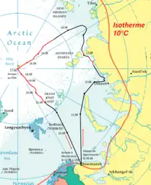 L'Arktika quitte Mourmansk le . Il était prévu qu'il aille en ligne droite vers le Pôle, mais de nouveaux calculs déterminèrent que les glaces au Nord de la mer de Kara seraient moins résistantes, et un nouvel itinéraire fut adopté. Le bateau a ensuite traversé le détroit de Vilkitski, rejoint la mer des Laptev, puis s'est dirigé vers le Pôle[5]. Le , l'Arktika a rencontré les premières glaces et a commencé à se frayer un chemin à travers elles.