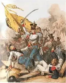 Les cavaliers portaient des équipements différents en fonction de leur fonction. Les cuirassiers portaient encore le harnois complet, par la suite la pièce protégeant le dos fut abandonnée par la majorité des armées. Sous cette armure, ils étaient habillés d'une veste d'uniforme, d'un pantalon long et d'un casque avec ou sans crête de fourrure. Les dragons et les chevau-légers portaient soit un heaume soit un shako selon leur armée. Les uhlans portaient une coiffure à part, un casque surmonté d'une rectangle appelé Chapska. Les hussards portaient un uniforme d'inspiration hongroise, constitué d'un dolman et d'un fourreau typique, ils portaient également la moustache[10].