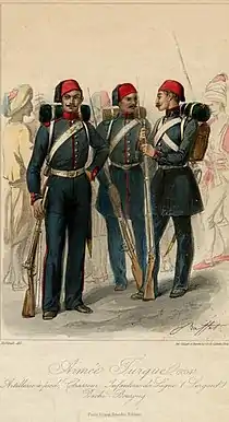 L'armée ottomane du XIXe siècle est issue des réformes du sultan Mahmoud II (1808-1839) : en 1826, celui-ci abolit les corps de troupe traditionnels, janissaires (infanterie) et sipahis (cavalerie), indisciplinés et inefficaces, au bénéfice de la « nouvelle organisation militaire » (nizâm-i djedîd), recrutée en partie parmi les éléments loyaux des janissaires et entraînée à l'européenne par des instructeurs étrangers[3]. Mahmoud II se méfie des Français, alliés du pacha d'Égypte Méhémet Ali, et fait de préférence appel à des Britanniques, des Russes et des Prussiens, dont le jeune lieutenant von Moltke. La marine ottomane est réorganisée, en même temps que l'école navale et celle des ingénieurs ; une école de médecine militaire, premier établissement d'enseignement laïc en Turquie, est créée en 1827. L'armée, sous le commandement unique du sérasker, porte un uniforme bleu de modèle prussien assorti d'un fez. Ce programme de réformes (Tanzimat), touchant aussi bien le domaine civil que militaire, est parachevé par le Khatt-i cherif, rédigé peu avant la mort de Mahmoud II en 1839 et promulgué par son successeur Abdülmecid Ier (1839-1861). Les sujets musulmans de l'Empire sont astreints au service militaire, par tirage au sort, pour cinq ans, suivis d'une période de réserve (redif) de sept ans[4]. L'effectif de l'armée atteint alors 150 000 hommes[1].