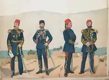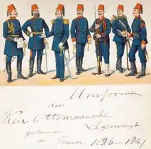 L'organisation militaire fixée par Hüseyin Avni Pacha, lui-même assassiné quelques jours après Abdülaziz, comporte un service militaire en plusieurs périodes : service actif (nizâm) de 4 ans pour les fantassins, 5 ans pour les cavaliers et artilleurs ; 2 ans de disponibilité (ichtiat), deux bans de redif de 3 ans chacun et 8 ans de mustahfiz. En temps de paix, l'armée compte environ 100 000 hommes, plus un effectif important de zaptiye (gendarmes) : le contingent annuel, qui était de 37 000 hommes, a été réduit à 11 000 en raison des difficultés budgétaires. En temps de guerre, en faisant appel aux réserves, l'armée peut rassembler entre 350 000 et 400 000 hommes, y compris les irréguliers (bachi-bouzouk) connus pour leur indiscipline et leurs exactions[18]. Elle se répartit entre 41 régiments turcs, 2 régiments bosniaques, 41 bataillons de chasseurs, 8 bataillons de garde-frontières, 26 régiments de cavalerie, 8 régiments d'artillerie de campagne (à 16 batteries de 6 pièces), 8 d'artillerie de forteresse, 2 du génie et 2 d'ouvriers d'administration[19].