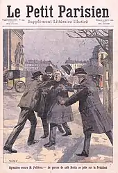 Le , en effectuant une promenade sur les Champs-Élysées, un garçon de café, qui fut Camelot du roi, nommé Jean Mattis, se jette sur le président Fallières pour lui tirer la barbe. Mais Armand Fallières réagit en voyant l'énergumène, et est griffé au cou et à l'oreille droite. Jean Mattis écope de quatre ans de prison[11].