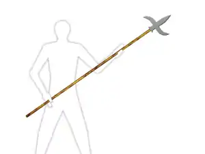 - Bardiche : arme originaire d'Europe de l'Est, composée d'un manche en bois pouvant être long de 2 m et d'un fer en forme de hache allongée.